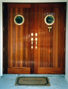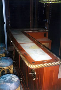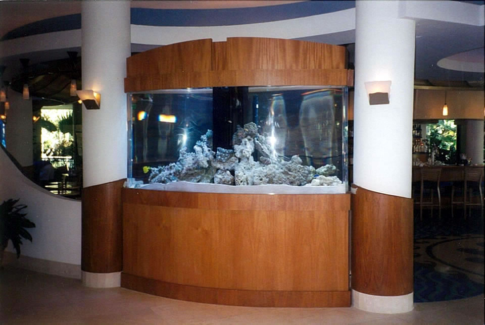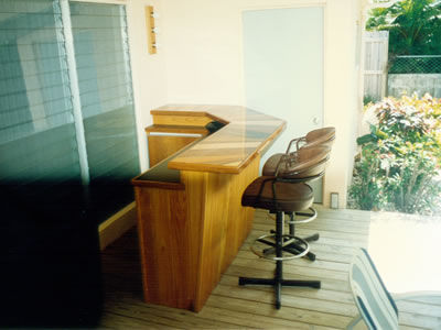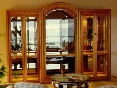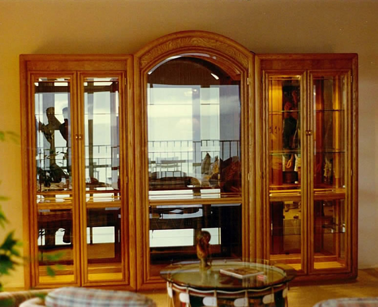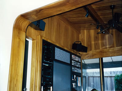 We did this Home Theater project in June 2010 in Tampa. We designed and built these Walnut cabinets and decor in collaboration with The Theater Doctor who provided all electronics for the video and sound system including a 65 inch plasma TV. The columns are solid Walnut and are 7 inches in diameter, supporting a beautiful arch with decorative trim and recessed back lighting. The cabinets on the two sides provide storage (on left side) for DVDs and it mirrors the right side's appearance which houses the electronics and subwoofer. Everything is Walnut inside and out. This built-in piece, like most of our projects, has a clear finish, no stains or dyes were used. This shows the natural beauty of the wood. There are 8 solid wood raised panel doors with soft close hinges and additional storage behind the speaker grill panels.